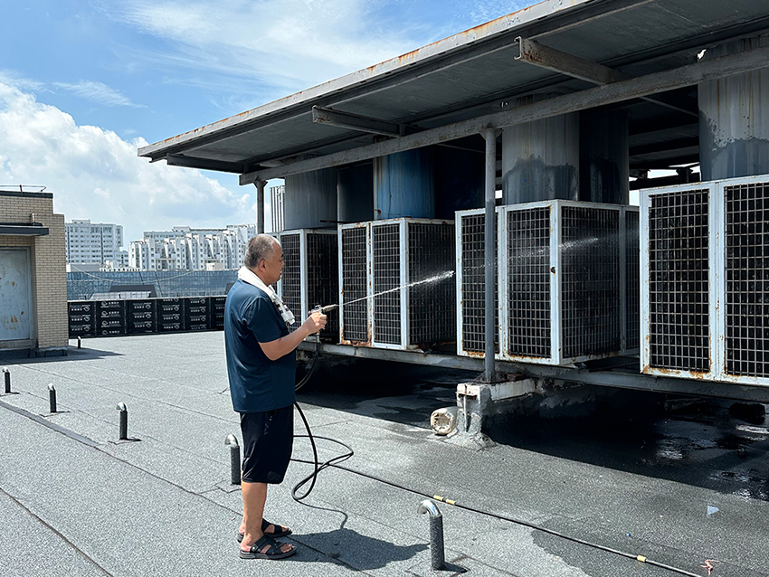 物業(yè)部陳仁生頂著烈日為民生店空調(diào)機(jī)組人工噴水降溫,確保機(jī)器運(yùn)轉(zhuǎn)。